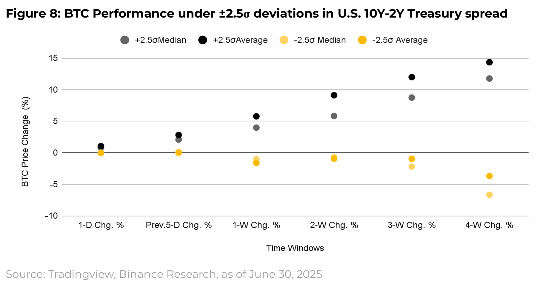 역사적으로 스프레드가 확대될 때 BTC 성과가 좋았는데, 이는 유동성 개선이나 성장 기대를 반영합니다. 하지만 인플레이션이나 적자 우려로 인한 확대는 BTC에 부정적일 수 있으니 주의하세요.