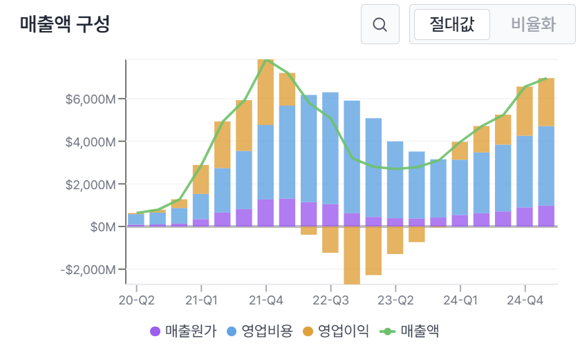 2025년 1분기 재무제표(10-Q)기준 손익계산서에서 총 수익은 16억 달러로 전년 동기 대비 112% 증가했으며, 순이익은 6천 5백만 달러로 흑자 전환했습니다^7.