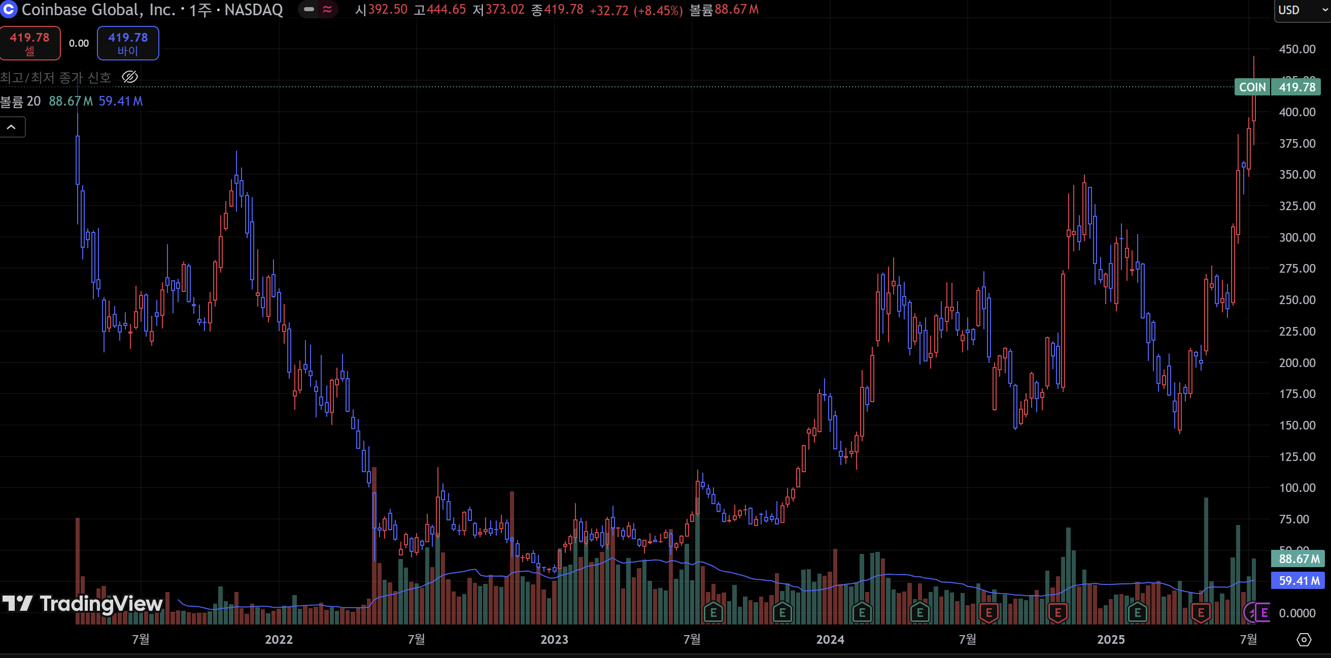 Coinbase(COIN) 최근 1년간 월별 종가 변화 (2024년 8월~2025년 7월)