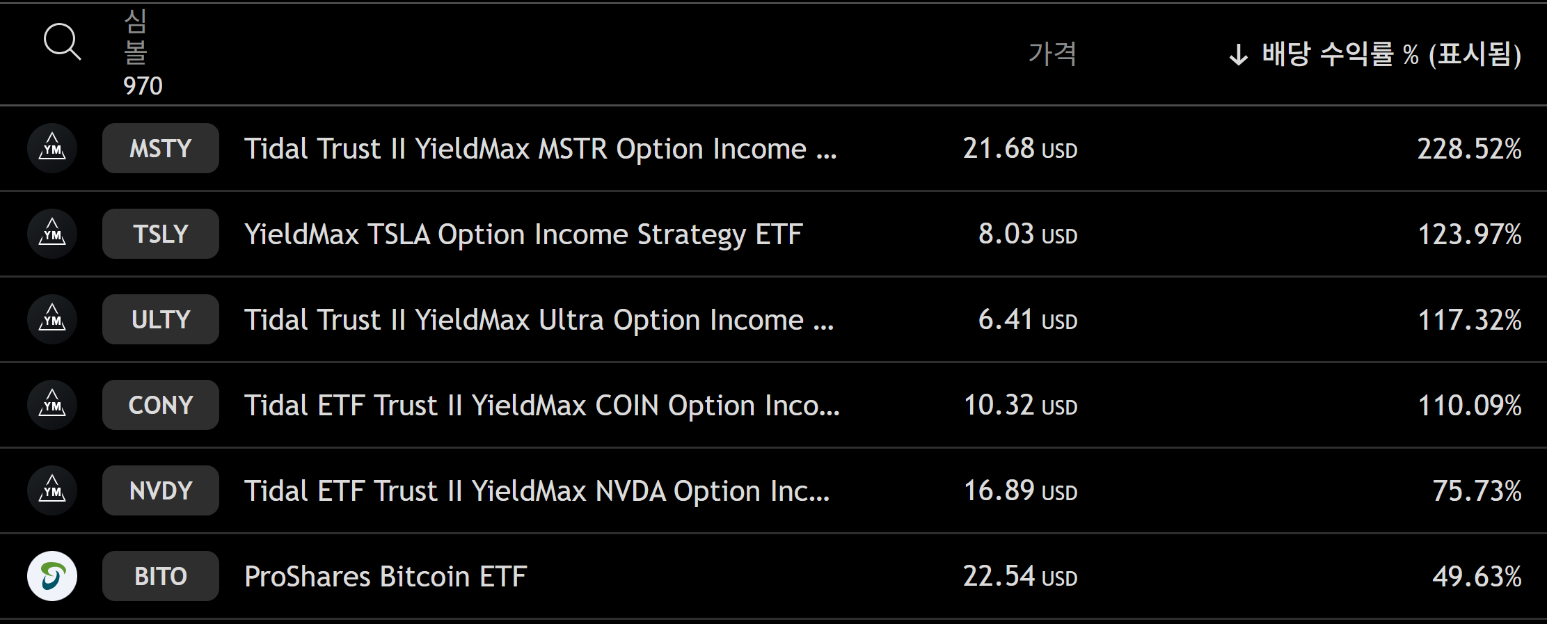이미지에서 본 MSTY, TSLY, ULTY, CONY, NVDY, BITO, MSTX 같은 ETF들은 평균 100% 이상의 배당률을 자랑해요. 각 ETF를 간단히 살펴볼까요? ^1^5