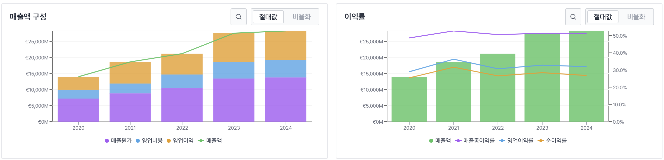 - 매출 성장: 2020년 139.8억 EUR → 2024년 282.6억 EUR (5년 CAGR 19.2%)