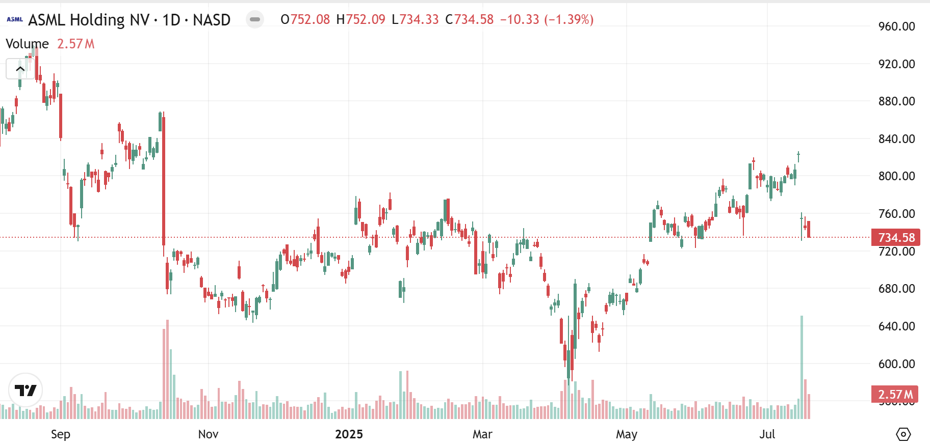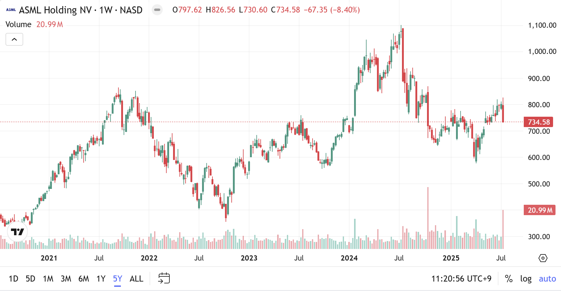 ASML은 반도체 제조에 필수적인 극자외선(EUV) 리소그래피 장비의 독점적 공급업체로, AI와 첨단 반도체 수요 증가에 따른 장기적 성장 잠재력을 보유하고 있습니다. 하지만 지정학적 리스크와 높은 밸류에이션이 단기적 투자 리스크로 작용하고 있죠.