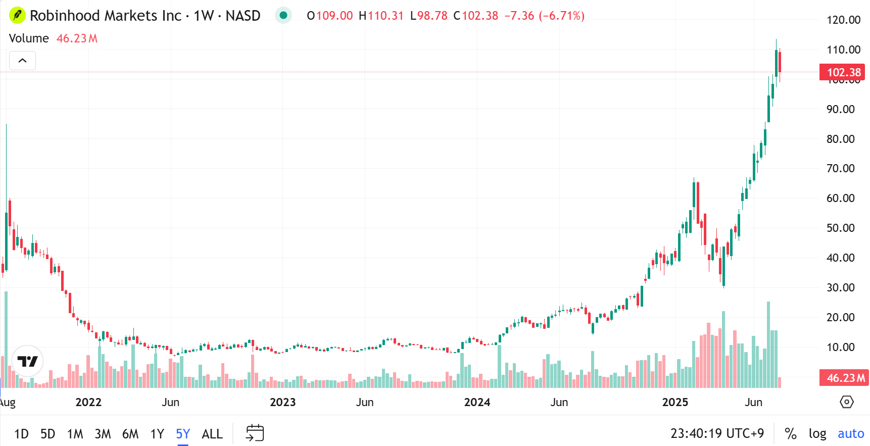 2024년-2025년 주가 차트 분석 결과, 로빈후드는 강력한 상승 추세를 보여주고 있습니다