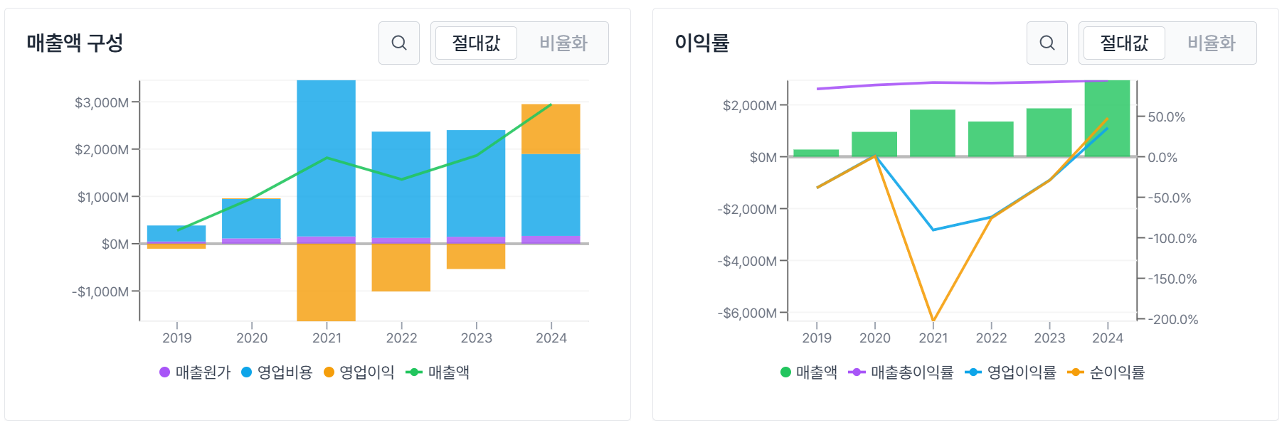 - 영업 마진: 35.8% (2023년 -28.5%에서 흑자 전환)