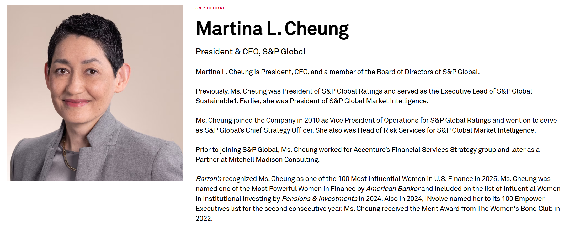 CEO 교체: 2024년 11월 마르티나 청(Martina L. Cheung)이 새로운 사장 겸 CEO로 취임했습니다. S&P Global Market Intelligence 사장과 Sustainable1 부문장을 역임하며 회사 내부에서 성장한 검증된 리더입니다.