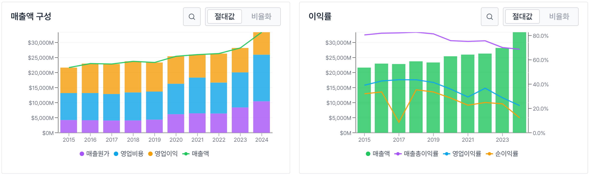 2024년 순이익은 40억 9천만 달러로 전년(67억 1천 7백만 달러) 대비 39.1% 감소했다. 이는 호라이즌 인수 관련 비용, 연구개발비 증가(25% 증가), 그리고 지분 투자 관련 손실이 주요 원인이다. 영업이익률은 21.7%로 전년(28.0%) 대비 하락했으나, 여전히 업계 평균을 상회하는 수준입니다.