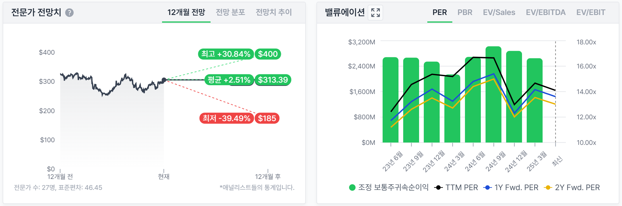 ValueInvesting.io의 성장 기반 DCF 모델에서는 325.01달러로 가장 높은 내재가치를 제시하며, 현재 주가 대비 10.3% 저평가 상태로 분석. Simply Wall St의 2단계 자유현금흐름 모델에서는 559달러라는 상당히 높은 내재가치를 제시하기도 합니다.