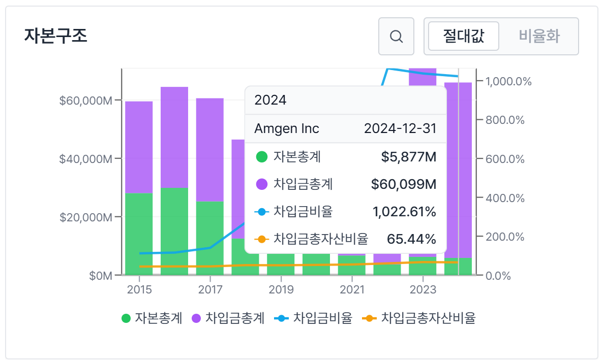 암젠의 현금 창출 능력은 매우 우수합니다. 2024년 자유현금흐름은 104억 달러를 기록했으며, 이는 안정적인 배당 지급과 연구개발 투자 확대를 뒷받침하는 핵심 요소이죠.
