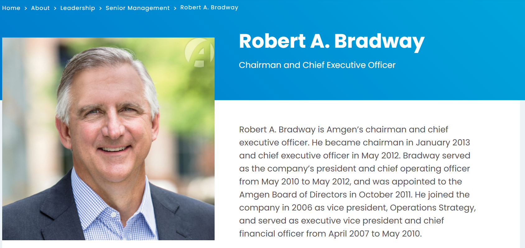 로버트 브래드웨이(Robert A. Bradway) CEO는 2012년부터 암젠을 이끌고 있으며, 강력한 리더십을 보여주고 있습니다. 모건스탠리에서 20년간 투자은행업무를 담당한 후 2006년 암젠에 합류했으며, CFO, COO를 거쳐 CEO로 승진한 경험이 있어요.