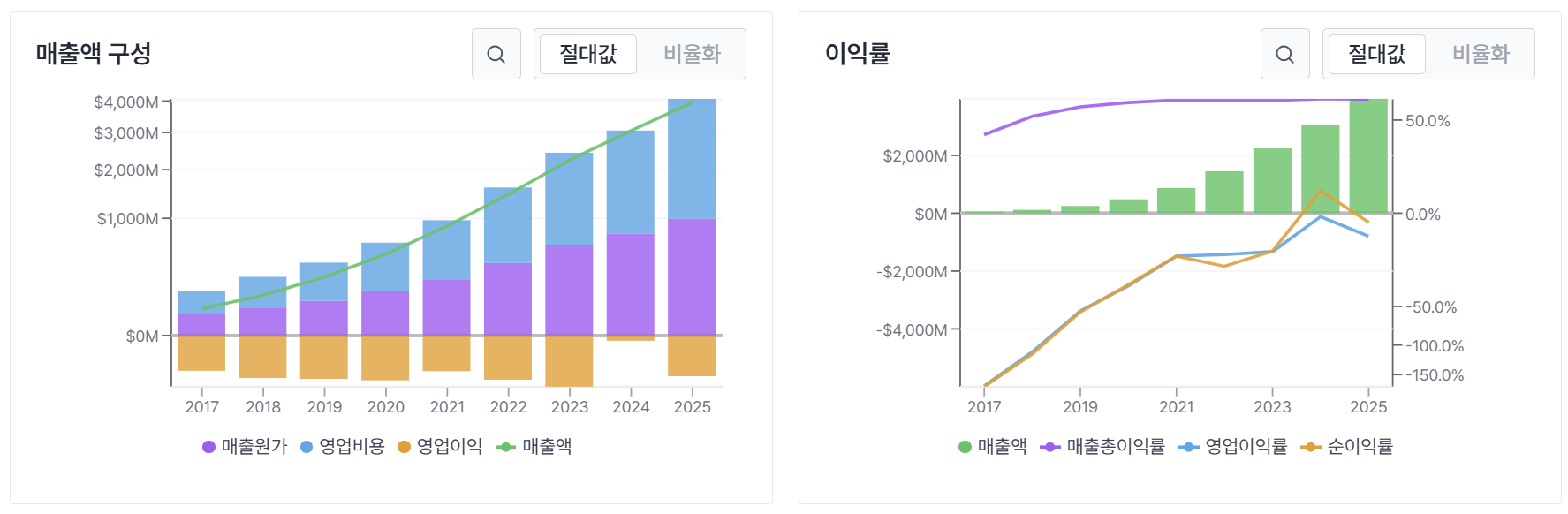 특히 주목할 점은 2024년에 순이익 흑자 전환($89.3M)을 달성했으나, 2025년에는 일시적으로 적자(-$19.3M)로 전환된 것입니다. 이는 2024년 7월 사건 관련 비용과 추가 투자 때문으로 분석됩니다.