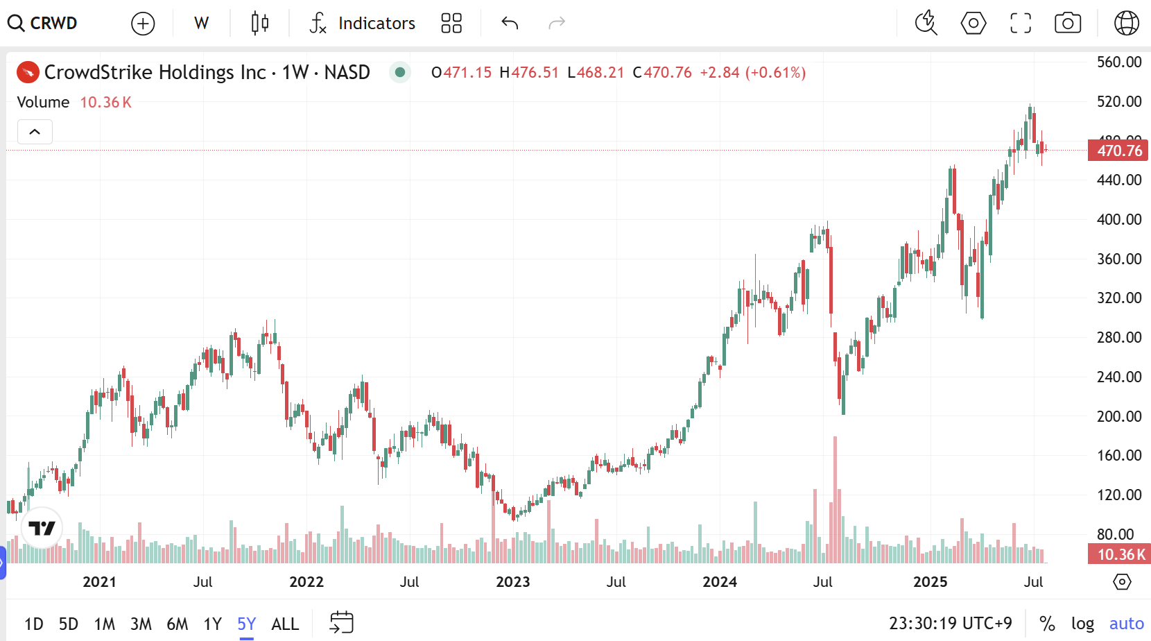 CrowdStrike (CRWD) 주가 차트: 2024년 7월 IT 대란 이후 회복 추세