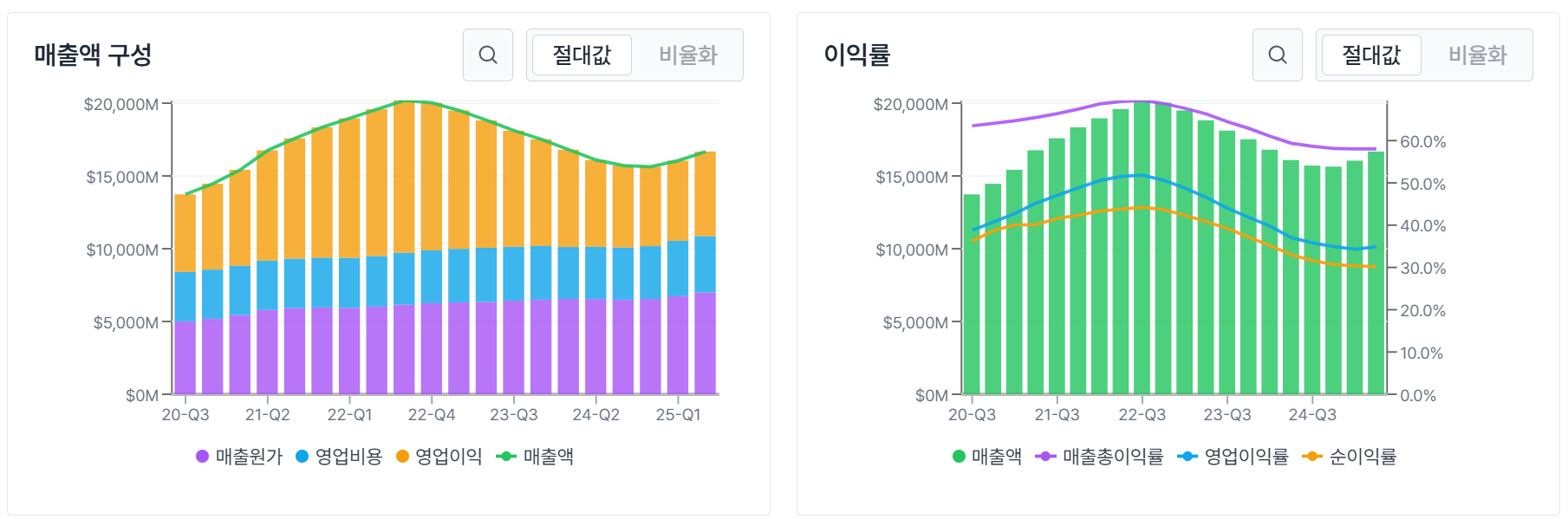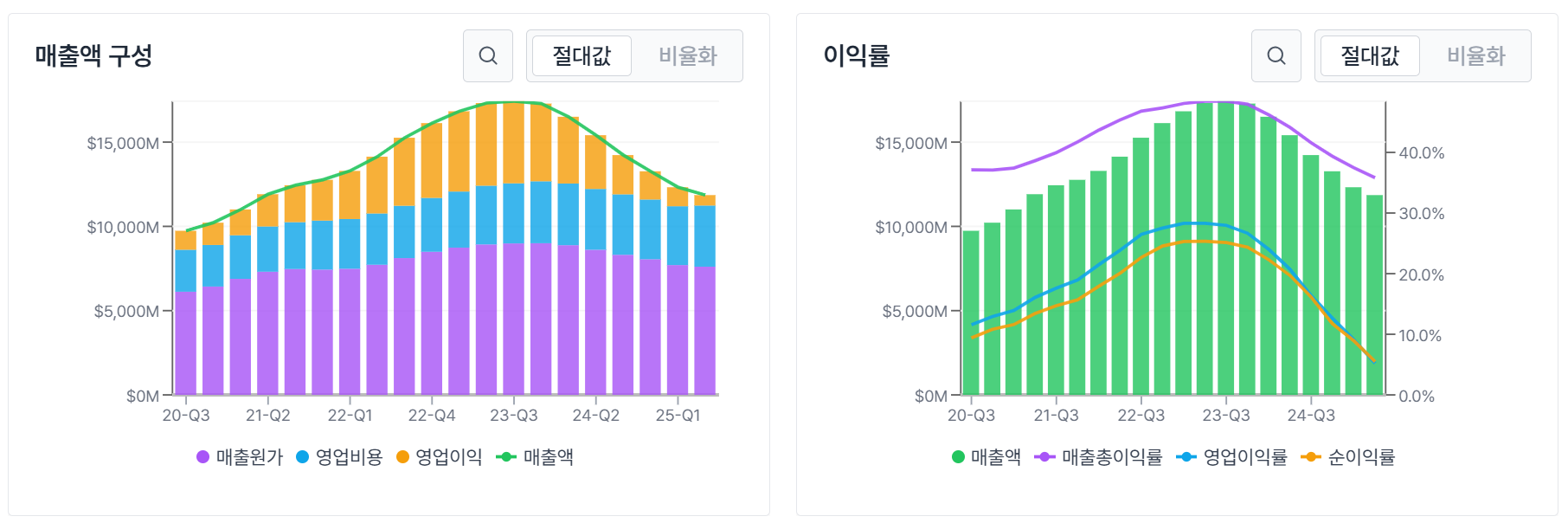 그러나 3분기 가이던스(예상 실적)는 보수적입니다. 매출 44.5~48.0억 달러로, 중국 관세 리스크와 약한 차량용 수요가 이유예요.