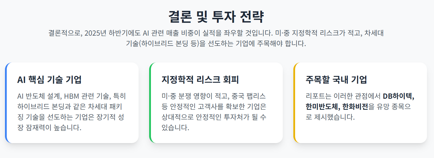 차량용과 산업용은 여전히 약세지만, AI 데이터센터 수요가 이를 상쇄하고 있어요. 국내 투자자라면 DB하이텍(중국 팹리스 고객 많아 미·중 분쟁 반사이익 기대), 한미반도체와 한화비전(하이브리드 본딩 장비 강자)을 주목하세요.
