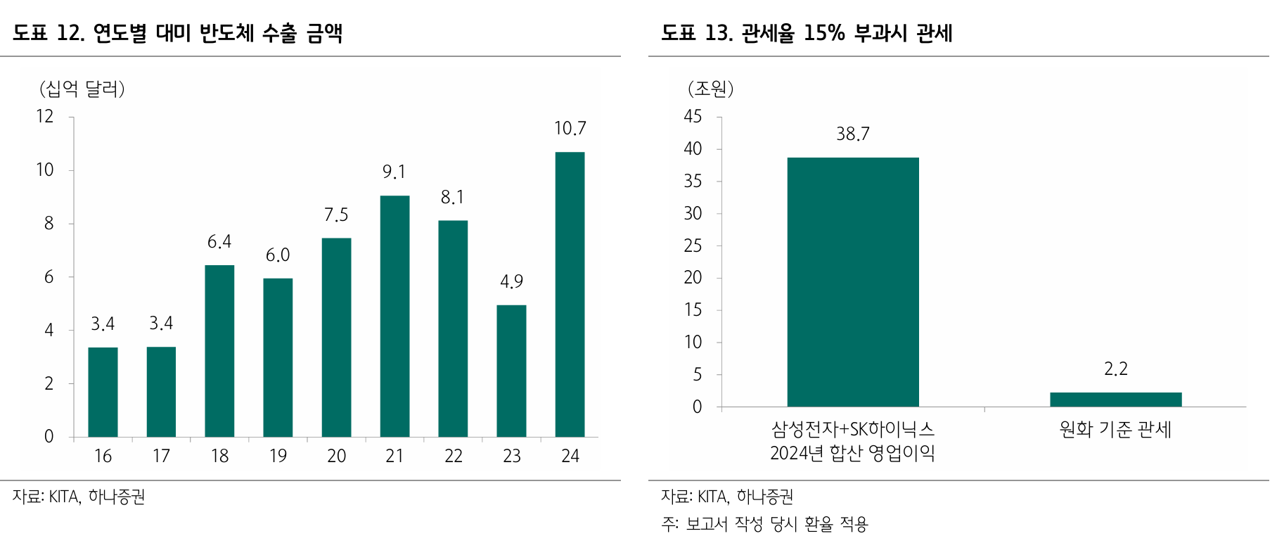 한국의 대미 반도체 수출은 2024년 107억 달러 규모로, 15% 관세 시 약 2.2조 원 부담이지만, 이는 삼성전자+SK하이닉스 영업이익(38.7조 원)의 5% 정도에 불과합니다.