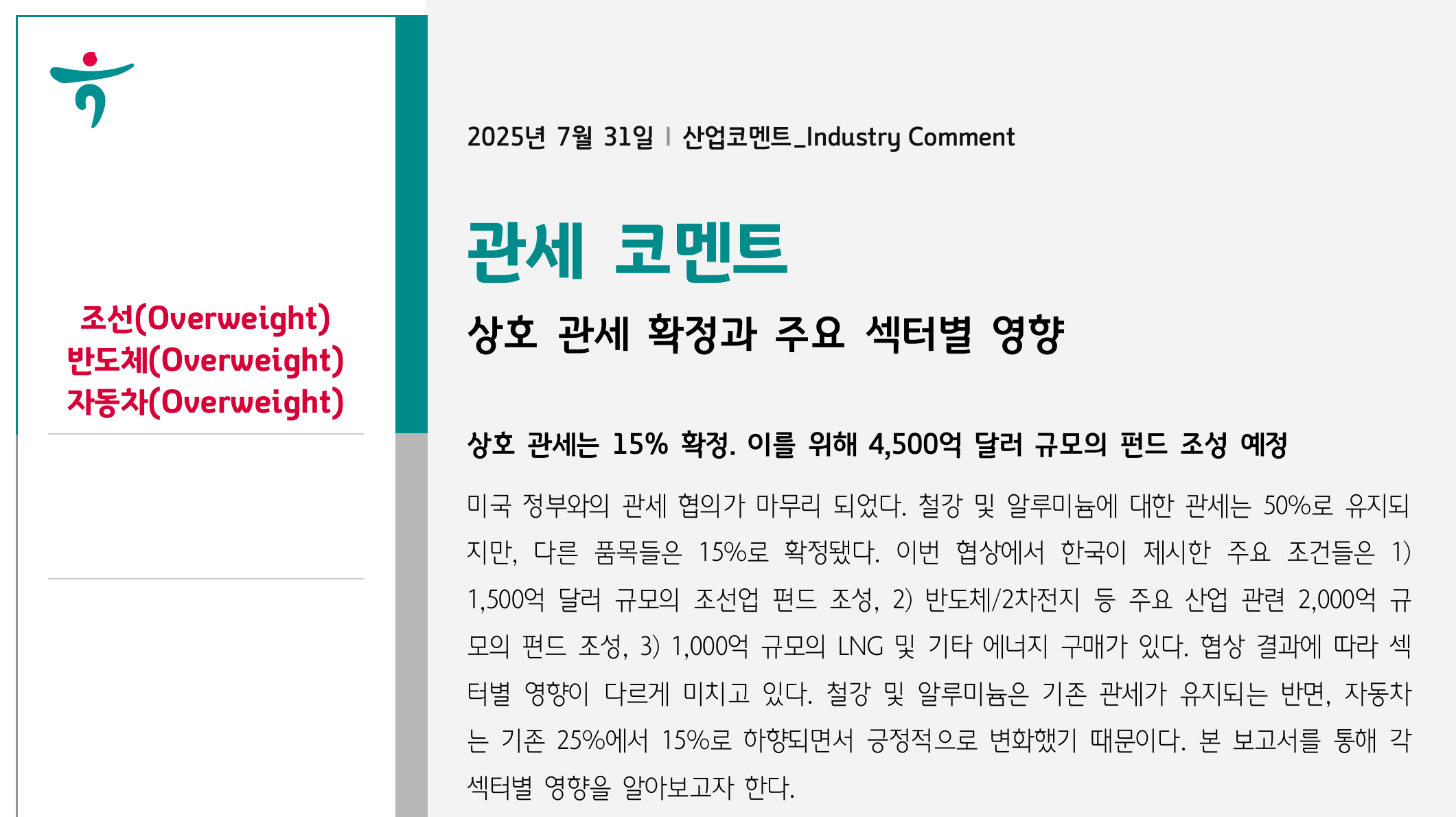 최근 뜨거운 이슈인 한미 상호 관세 협상 결과를 다뤄보겠습니다. 2025년 7월 31일 하나증권의 보고서를 바탕으로, 이 협상이 한국의 주요 산업에 어떤 영향을 미칠지 흥미롭게 풀어보죠.