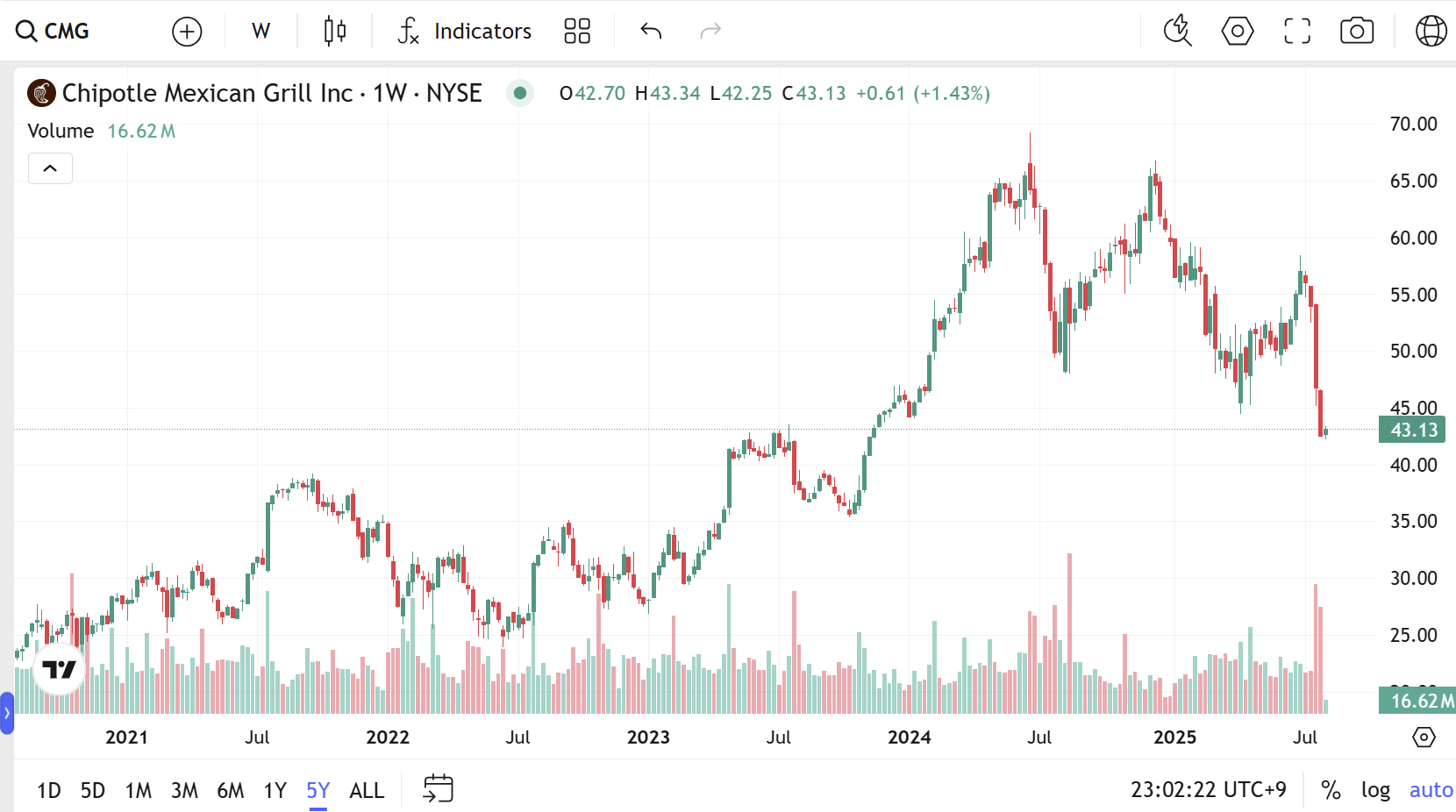 치폴레 주가(CMG)는 7월 초 약 58달러에서 8월 4일 42.88달러로 약 26% 하락했습니다^7.