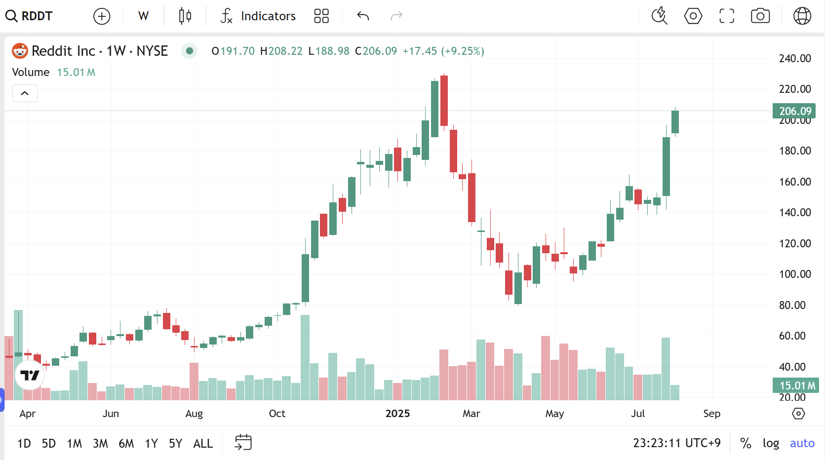 - 강력한 2분기 실적 발표(주요 상승 원인): 2025년 7월 31일, Reddit이 2분기 실적을 발표하며 매출 5억 달러(전년 대비 78% 증가)와 순이익 8,900만 달러를 기록했습니다. 추정치(매출 4.26억 달러)를 17% 초과하는 수준으로, 회사의 최대 실적 초과 달성입니다^12. 또한, 일일 활성 사용자(DAU)가 1억 1,040만 명으로 21% 증가한 점이 투자자 신뢰를 높였습니다^13.
