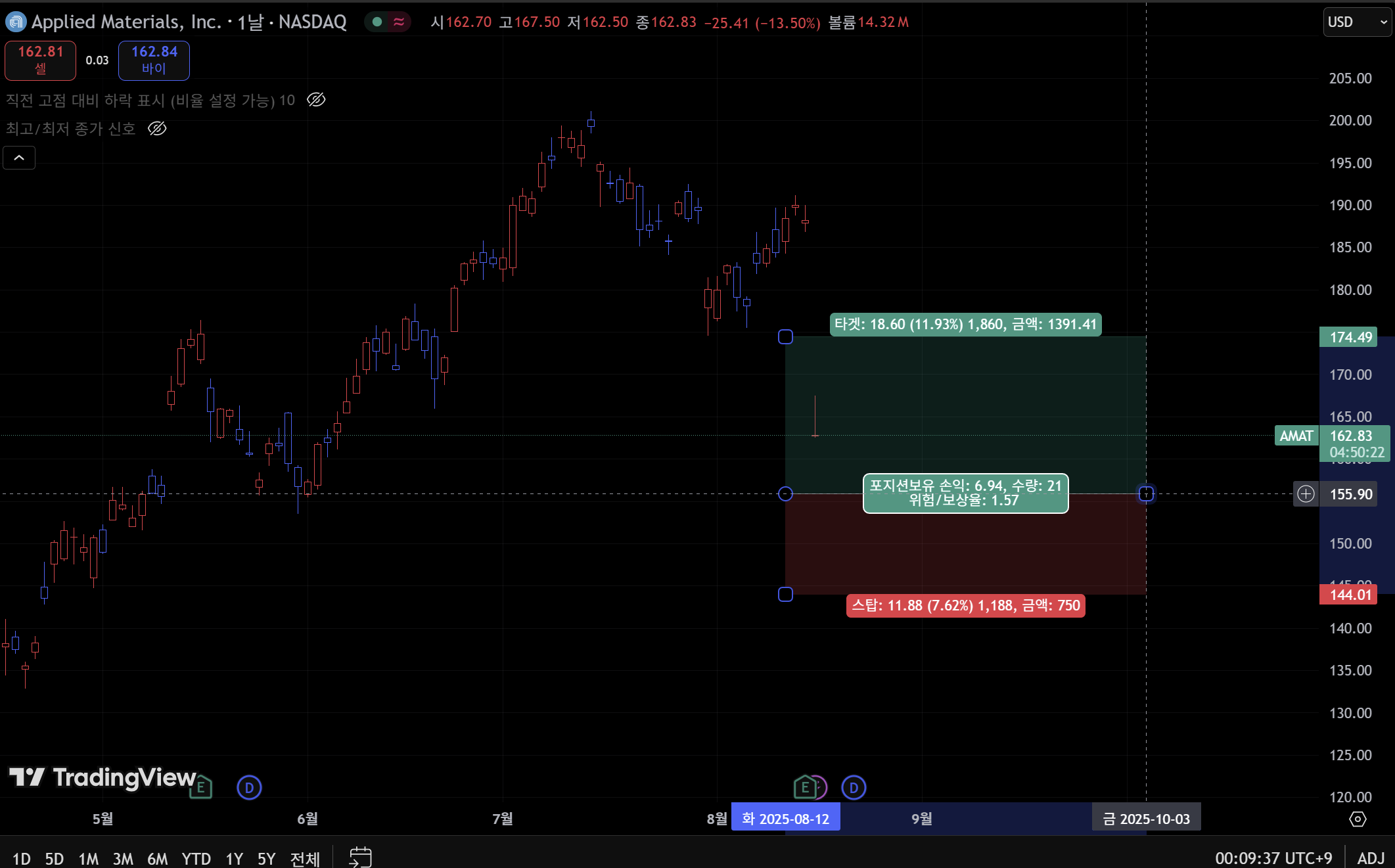 2025년 8월 14일(미 동부 기준), Applied Materials의 주가는 실적 발표 이후 하루 만에 13% 넘게 급락해 $163대까지 내려앉았습니다.