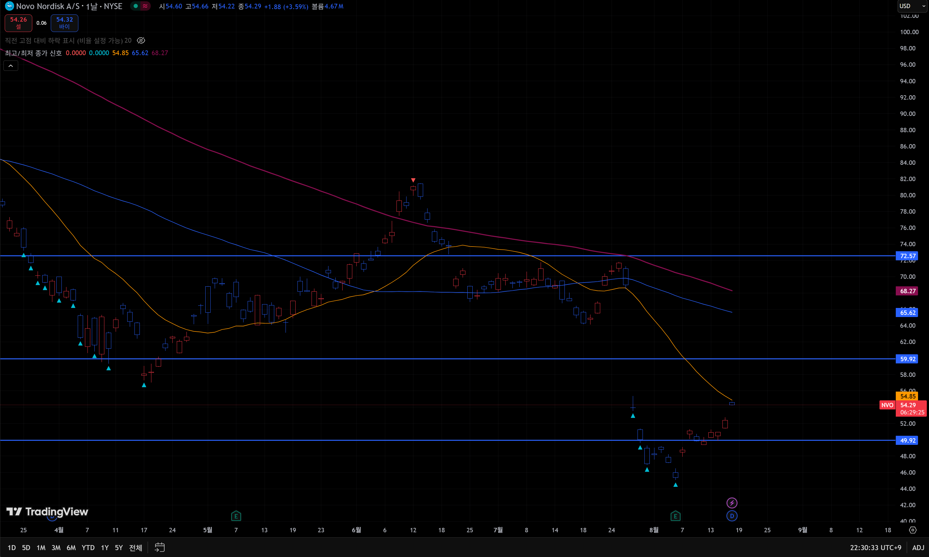 - 현재 가격과 추세: NVO 주가는 최근 $56.15로 마감하며, $51 저항선을 돌파한 bullish (상승) 추세를 보입니다. 그러나 2025년 들어 70% 하락으로 인해 변동성이 큽니다.^6