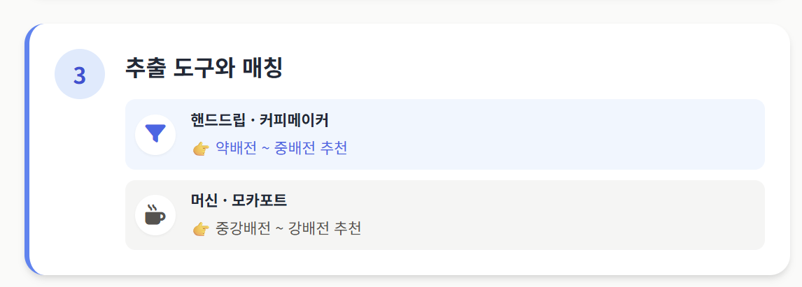 - 도구 매칭: 핸드드립은 밝게(약/중배전), 머신은 진하게(중/강배전)