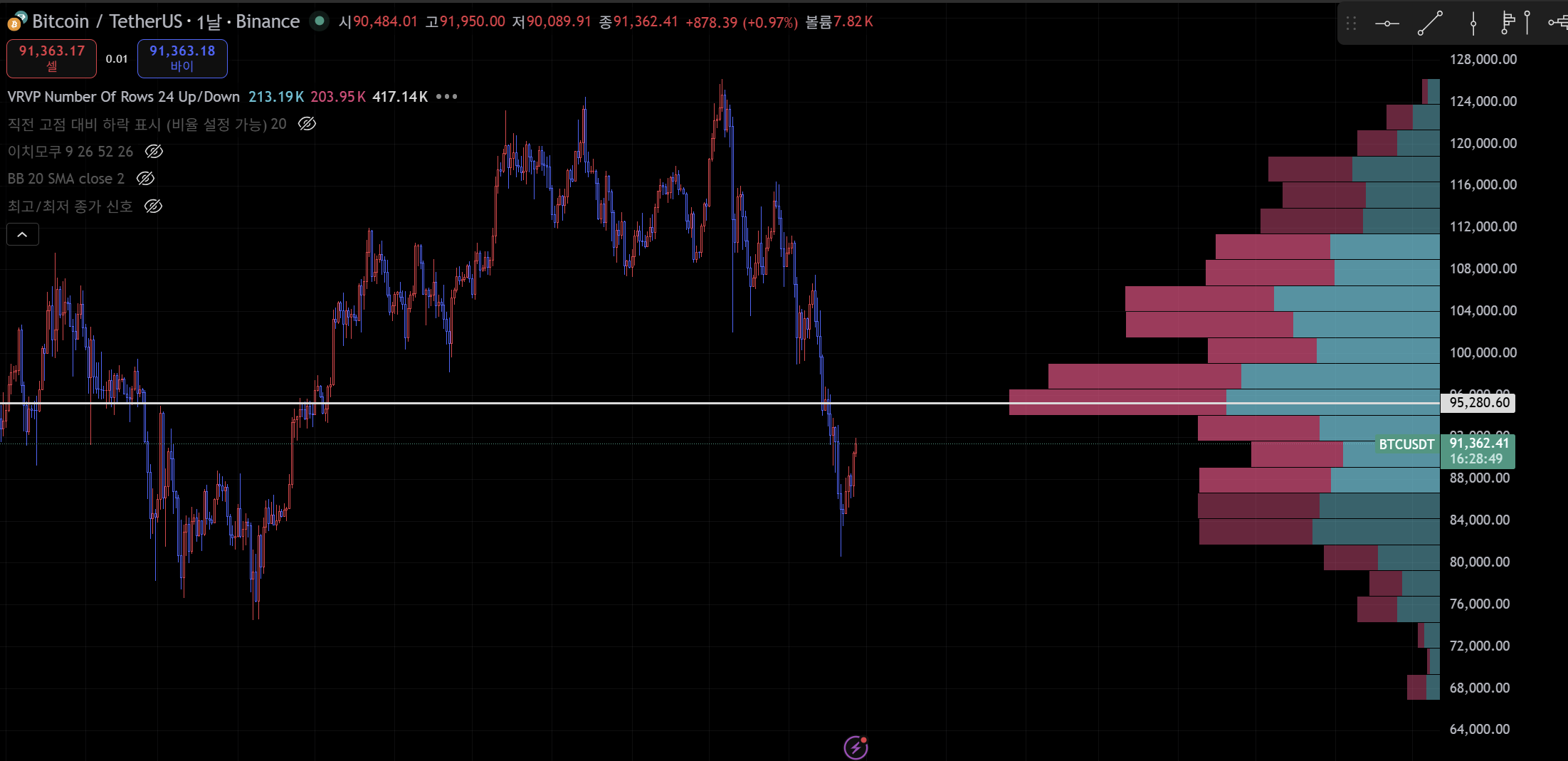 - 기능: 무료 버전에서는 사용할 수 없었던, 가격대별 거래량을 가로 막대그래프로 보여주는 기능입니다. 특히 VPVR(Visible Range) 기능이 핵심입니다.