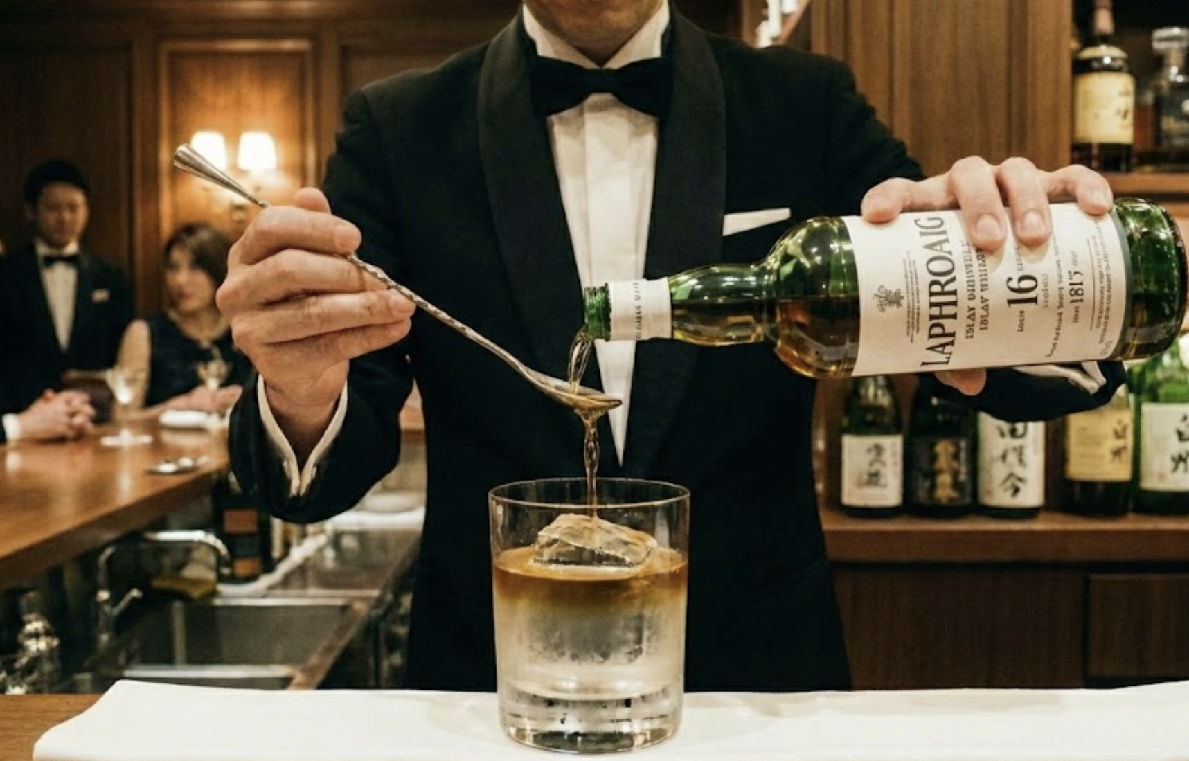 - 플로팅 (Floating): 가장 중요한 단계입니다. 바스푼을 이용해 아일라 위스키(Laphroaig 등)를 얼음 위나 칵테일 표면에 조심스럽게 띄웁니다.