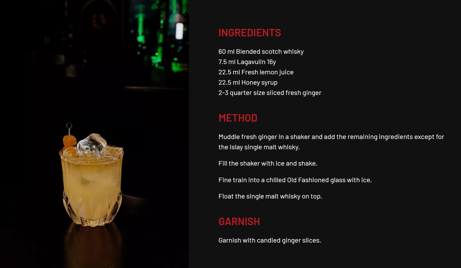위스키 사워의 변형처럼 보이지만, 생강의 알싸함과 아일라 위스키의 피트(Peat) 향을 더해 전혀 새로운 차원의 맛을 선사합니다.