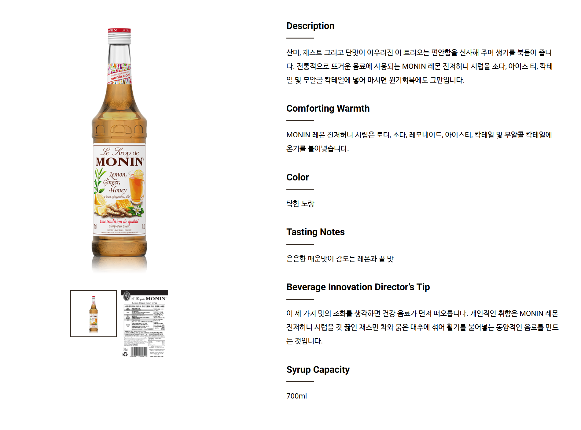 | 허니-진저 시럽 | 22.5ml (3/4 oz) | 꿀 시럽과 진저 시럽을 1:1로 섞거나 직접 만든 시럽 사용 |