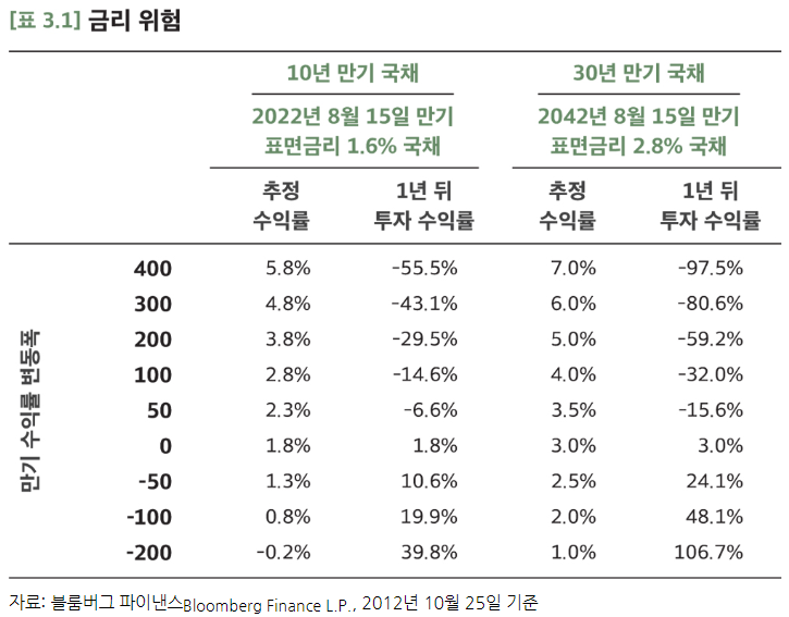 변동성이 유일한 위험요소는 아니다. 위험 요소는 수없이 많다. 흔희 간과되는 위험에 금리위험이 있다. 금리위험이란 금리가 오르내리면서 수익률에 영향을 주는 위험이다. 금리상승폭이 클수록, 투자 총수익은 나빠진다.