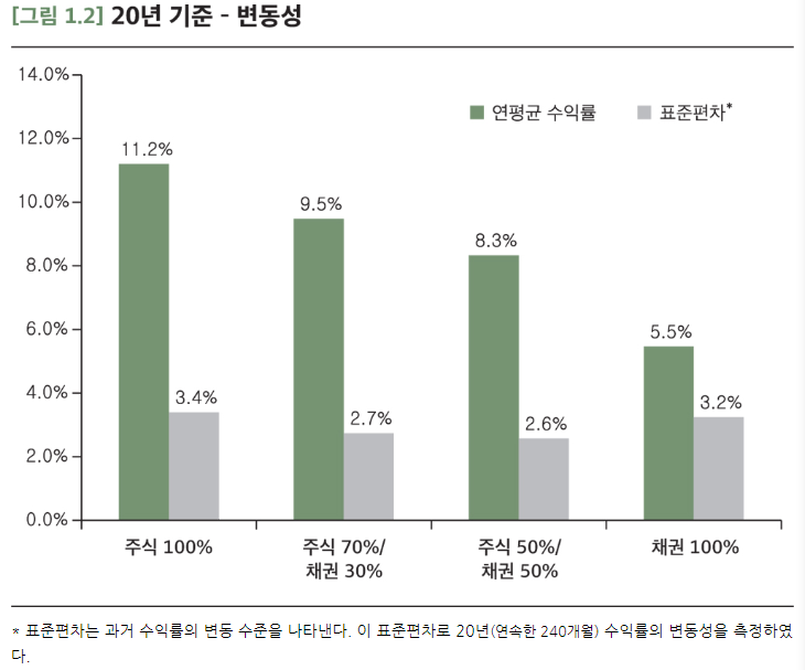 채권도 변동이 심하다. 채권 가격은 금리와 반대방향으로 움직인다. 단기적으로는 채권의 변동성은 주식보다 작으며 기대수익률은 낮다. 그러나 분석하는 단위기간을 늘리면 장기적으로는 주식의 변동성이 채권보다 작았으며 수익률은 더 높았다.