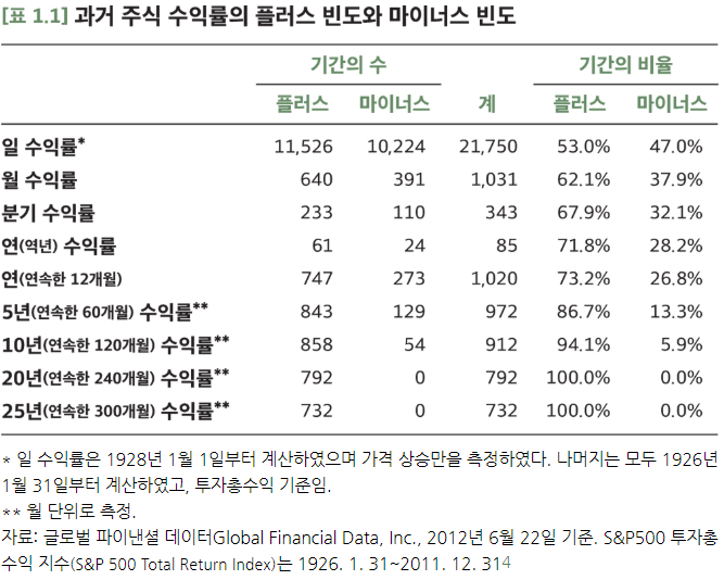 일 단위로 보면 주식 수익률이 플러스일 확률은 50%보다 약간 더 높은 정도이다. 하지만 12개월 단위로 보면 플러스일 확률은 73.2%가 된다. 하지만 사람들은 단기적 사고를 벗어나기 어려워 주식하락에 더 큰 위험을 느낀다.