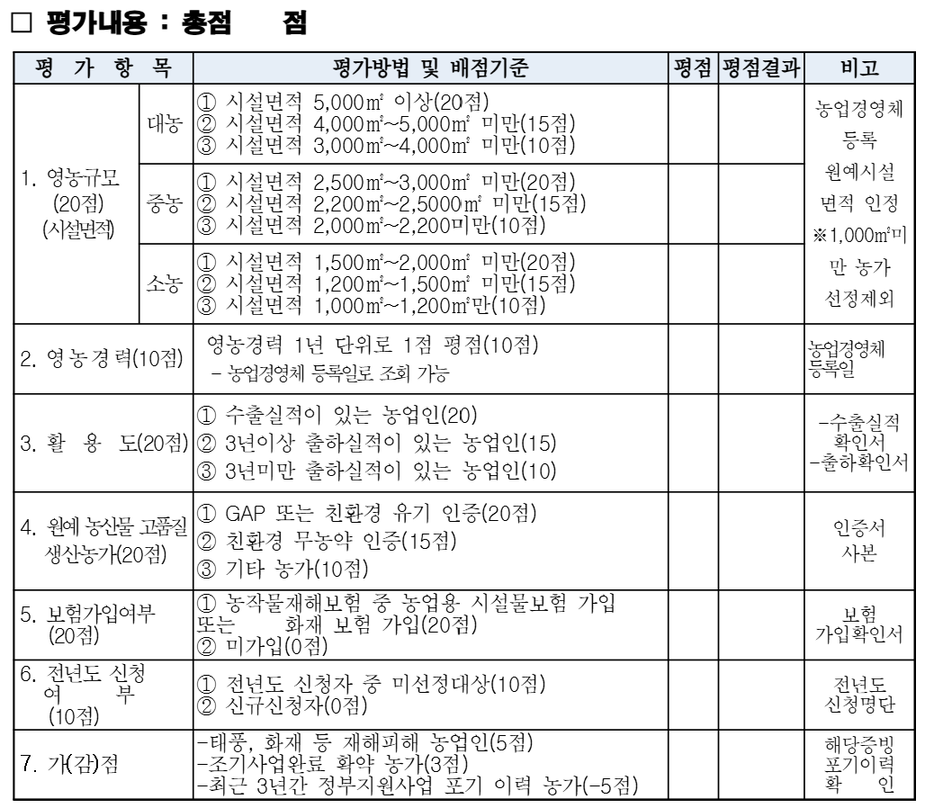 - 시설면적이 1,000㎡ 미만이거나 영농 경력이 4년 미만인 경우 지원 대상에서 제외됩니다.