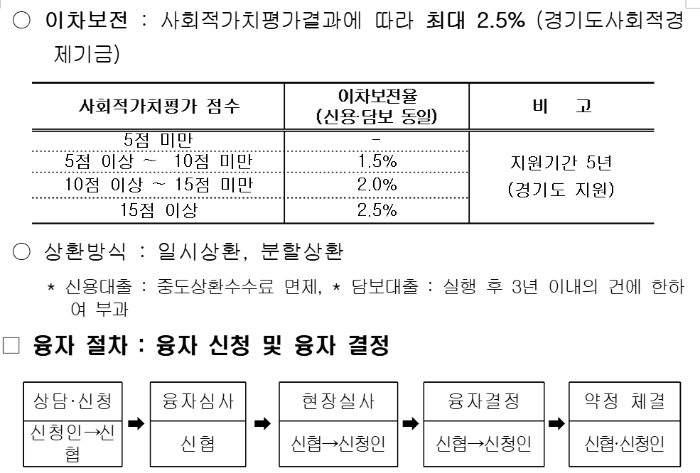- 이차보전(이자지원)은 사회적가치평가 결과에 따라 최대 2.5%까지 가능하며(경기도사회적경제기금), 점수 구간에 따라 1.5%/2.0%/2.5%가 적용됩니다.