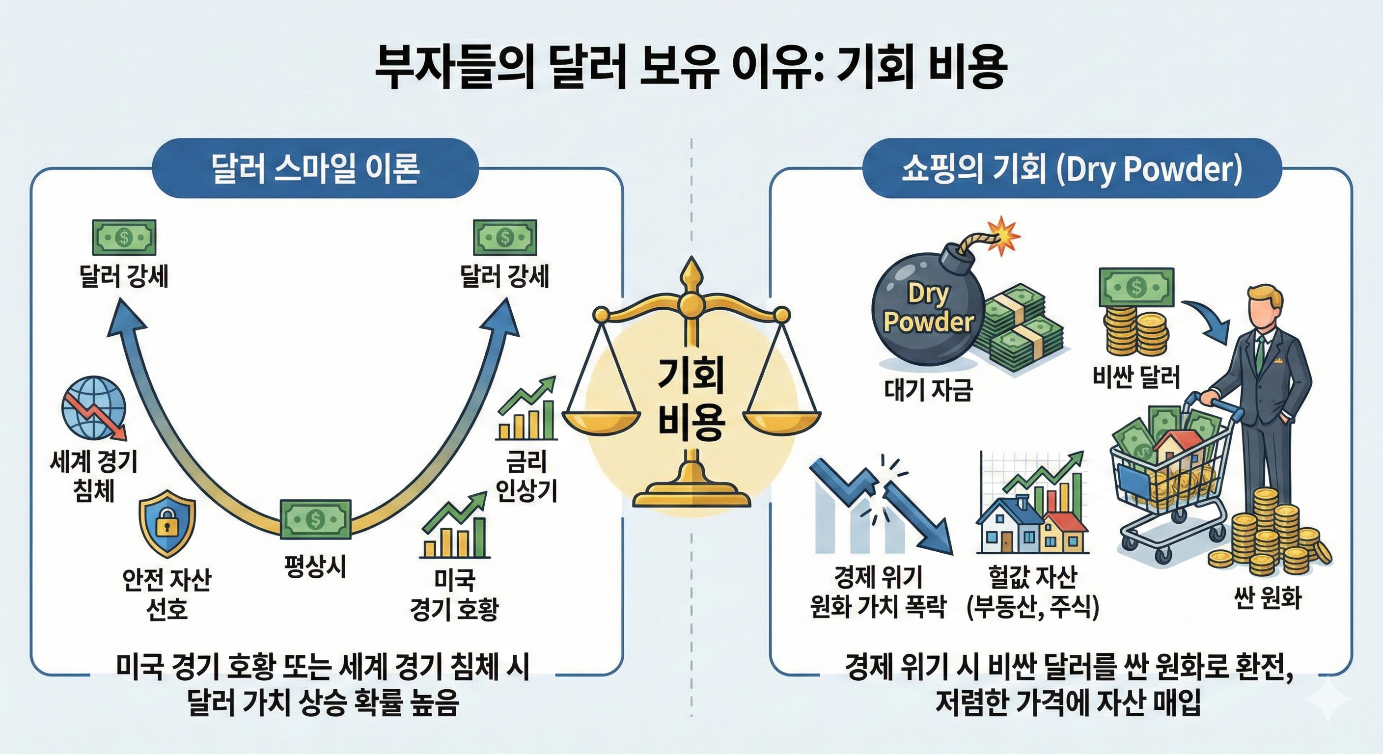 - 쇼핑의 기회 (Dry Powder): 경제 위기가 닥쳐 원화 가치가 폭락하고 국내 우량 자산(부동산, 주식)이 헐값이 되었을 때를 상상해 보십시오. 이때 미리 확보해둔 '비싼 달러'를 '싼 원화'로 환전하면, 남들보다 훨씬 저렴한 가격에 자산을 매입할 수 있는 강력한 구매력이 생깁니다. 부자들은 이 타이밍을 위해 달러를 '대기 자금(Dry Powder)'으로 활용합니다.