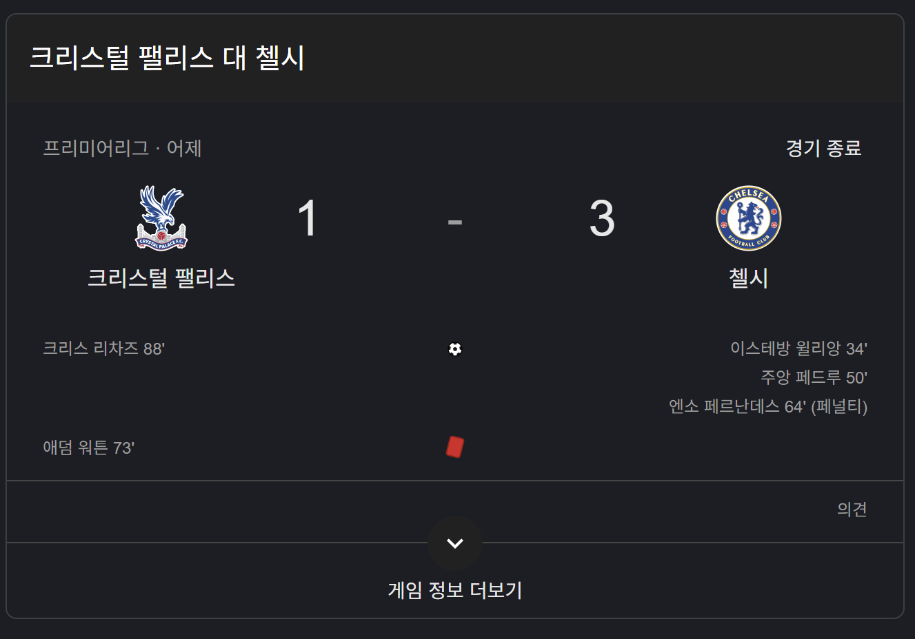 - 쐐기골: 후반 중반, 크리스털 팰리스의 아담 워튼이 거친 태클로 경고 누적 퇴장을 당하며 수적 우위까지 점한 첼시는 엔조 페르난데스가 페널티킥을 성공시키며 승부에 쐐기를 박았습니다.