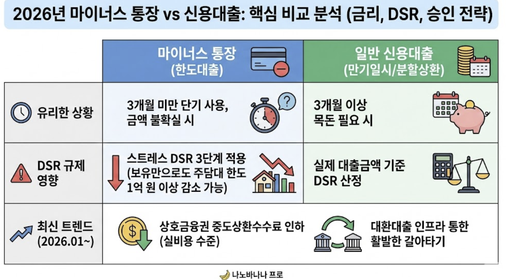 2026년 마이너스 통장 vs 신용대출 비교: 금리, DSR, 승인 전략 분석