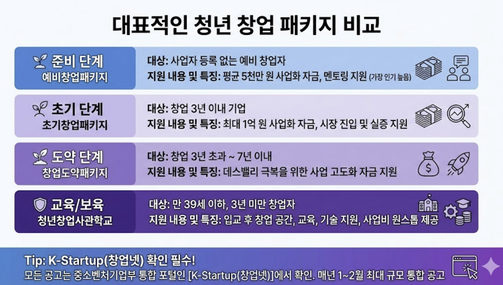 Tip: 모든 공고는 중소벤처기업부 통합 포털인 [K-Startup(창업넷)]에서 확인할 수 있습니다. 매년 1~2월에 가장 큰 규모의 통합 공고가 나오니 이 시기를 놓치지 마세요.