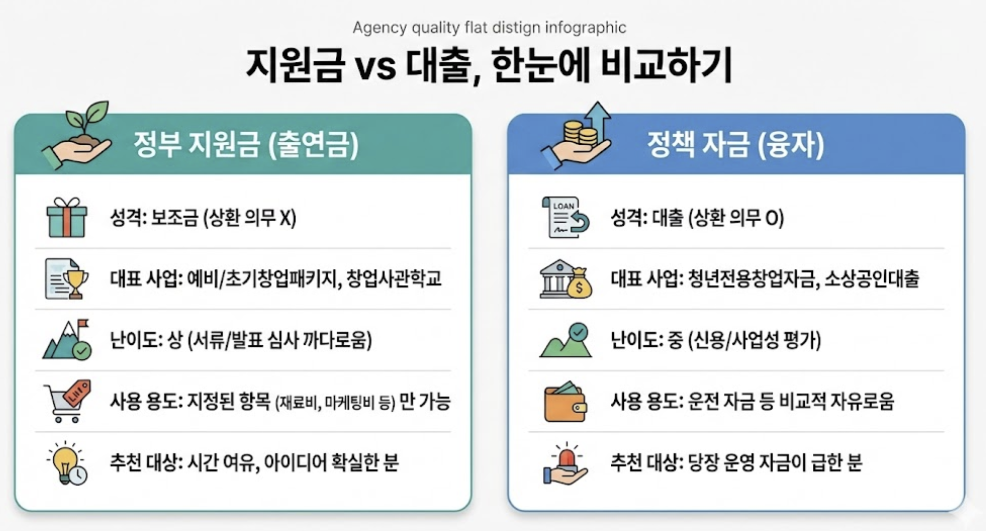 많은 예비 대표님들이 가장 헷갈려 하는 부분이 바로 '지원금''정책 자금(융자)'의 차이입니다. 어떤 돈은 사업 실패 시에도 갚을 필요가 없지만(면책), 어떤 돈은 고스란히 빚으로 남기도 합니다.