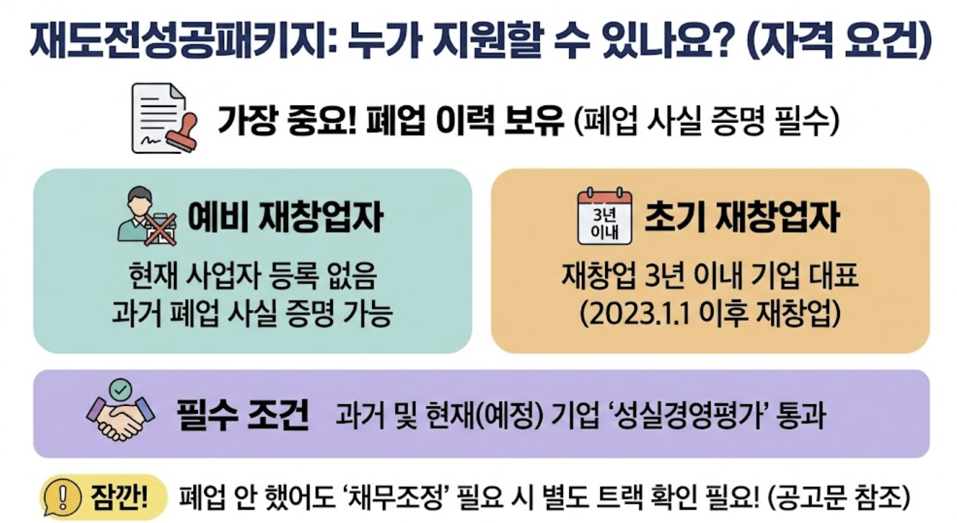 - 자격: 폐업 이력이 있는 예비 또는 3년 미만 재창업자.