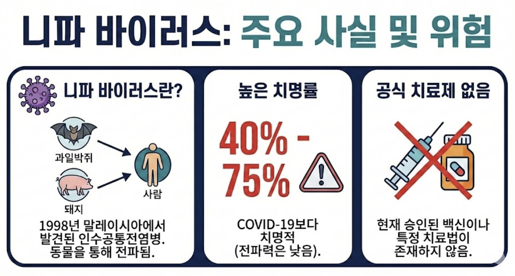 - 위험성: 치사율이 40%에서 최대 75%에 이르며, 전파력은 코로나19보다 낮지만 치명률은 훨씬 높습니다.