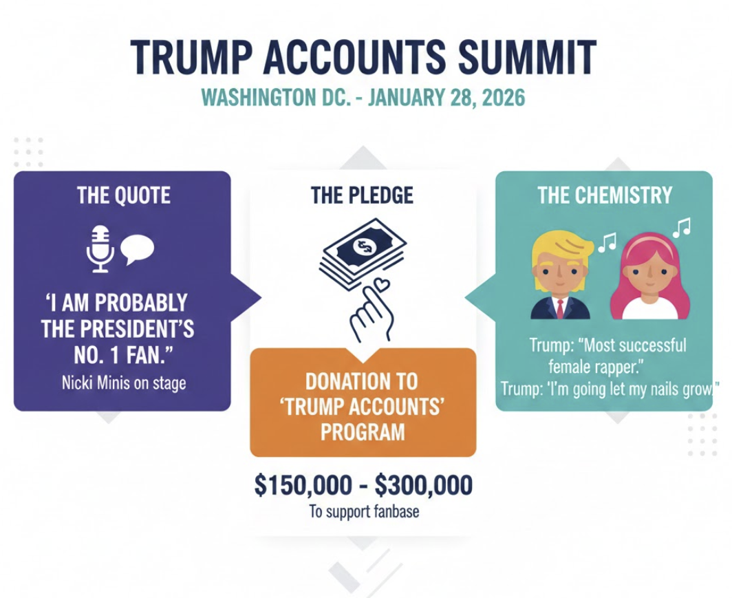 On January 28, 2026, Nicki Minaj made a surprise appearance at the Trump Accounts Summit in Washington, D.C. The event was designed to launch a new government program investing in American-born children.