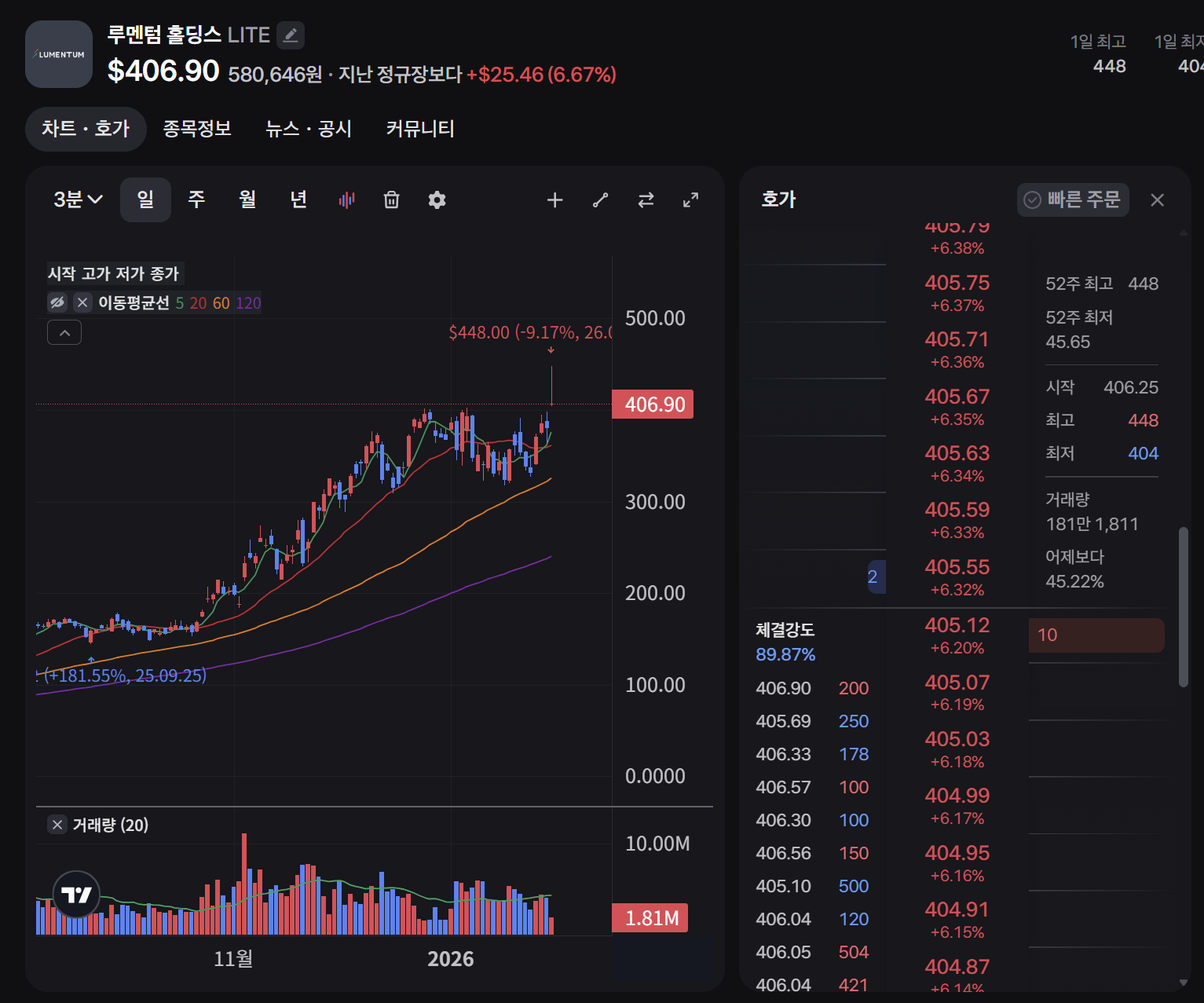 - 현재 상황: 루멘텀(LITE)은 AI 데이터센터 광학 인프라 시장의 선두주자로, 2026년 1월 30일 기준 주가는 사상 최고가인 $406.25를 기록했습니다.