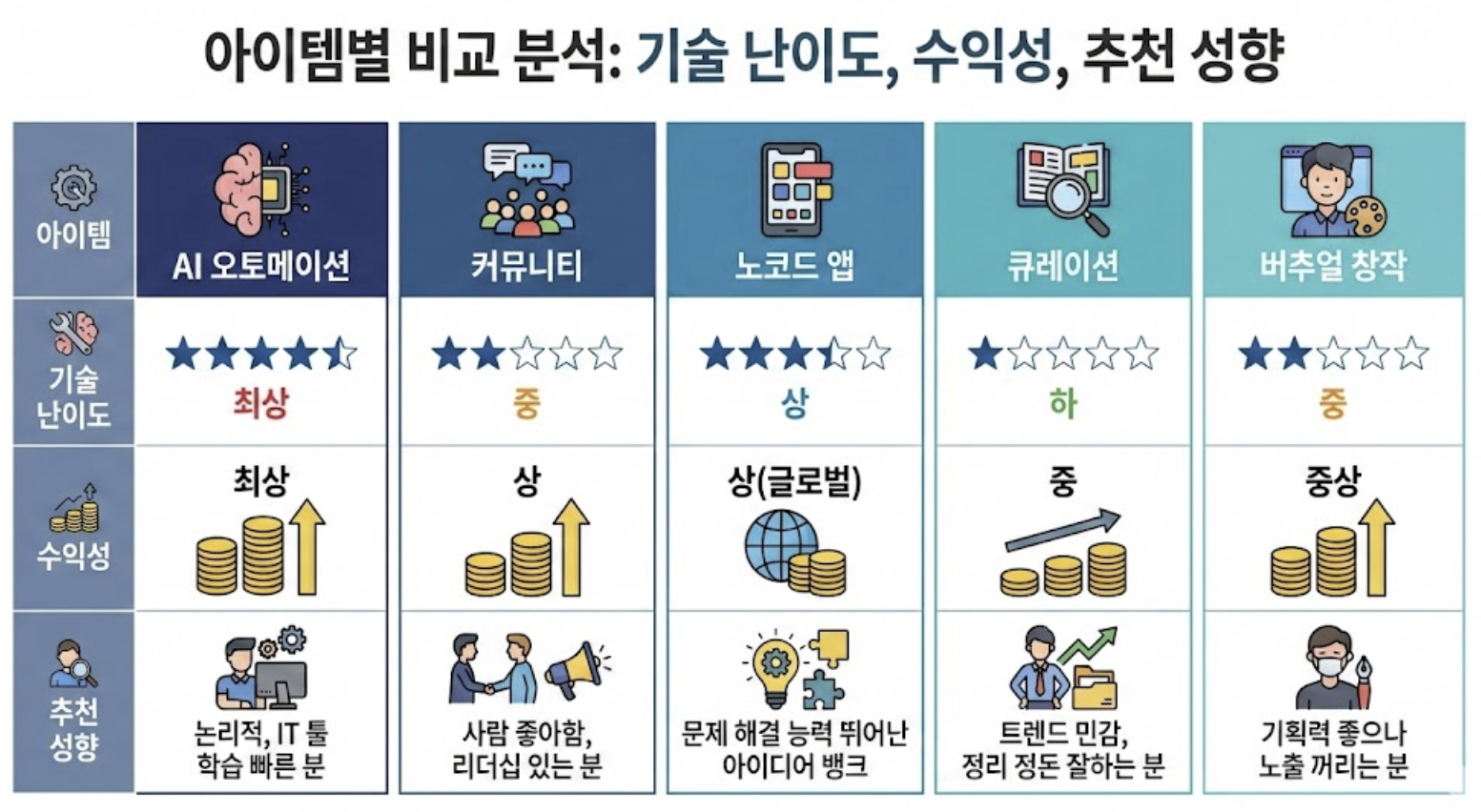 | 아이템 | 기술 난이도 | 수익성 | 추천 성향 |