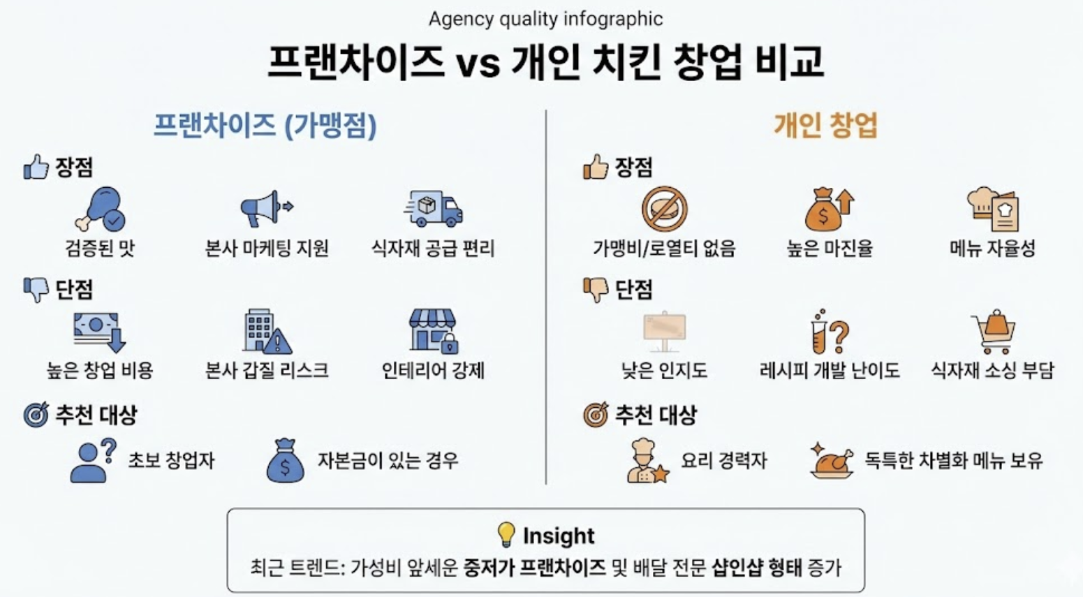 | 단점 | 높은 창업 비용, 본사 갑질 리스크, 인테리어 강제 | 낮은 인지도, 레시피 개발 난이도, 식자재 소싱 부담 |