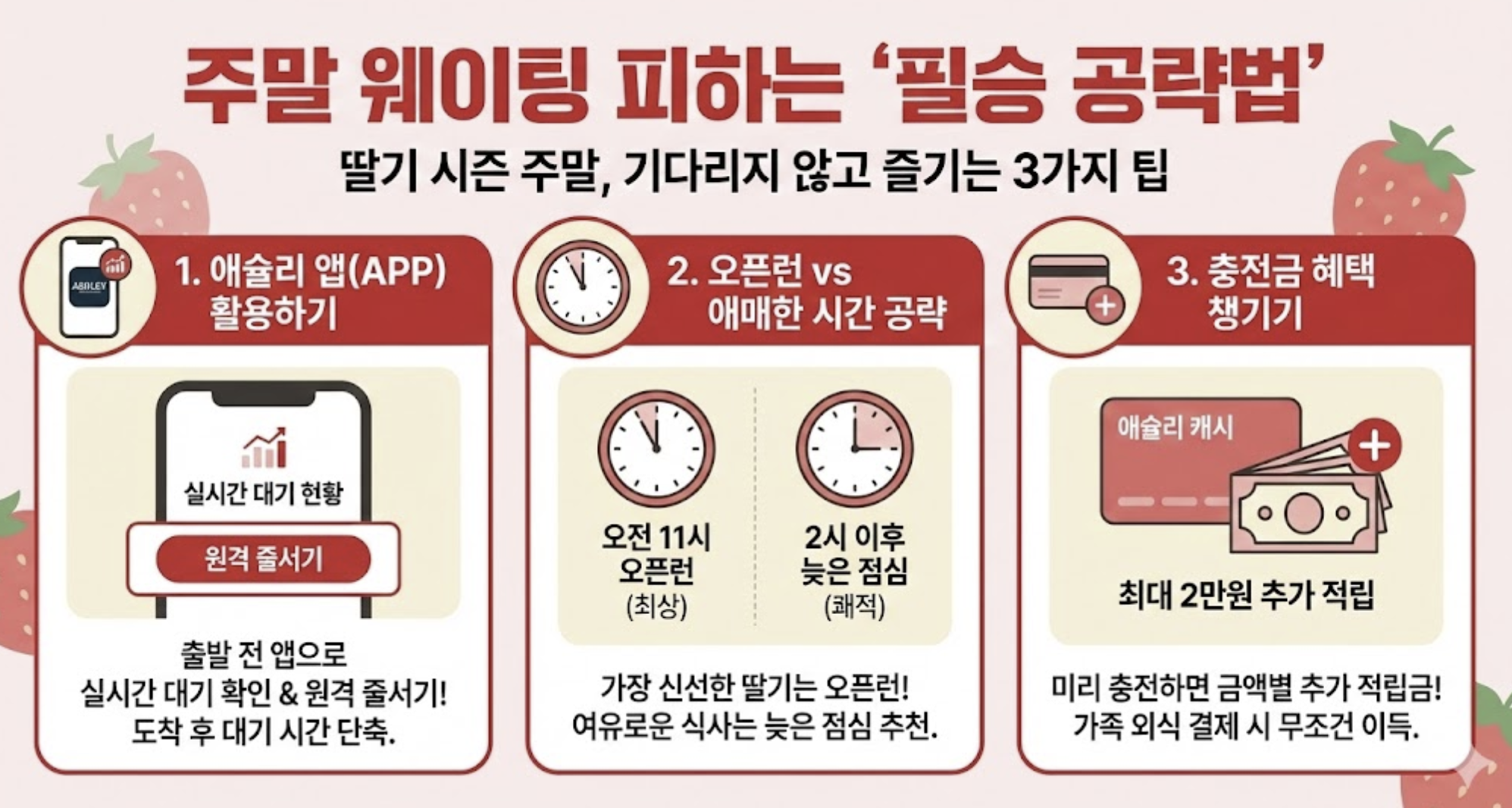 가장 추천하는 시간은 오전 11시 오픈런입니다. 딸기 상태가 가장 최상일 때 입장할 수 있습니다. 만약 런치를 노린다면 차라리 2시 이후 늦은 점심을 공략하는 것이 쾌적합니다. - 💳 충전금 혜택 챙기기: