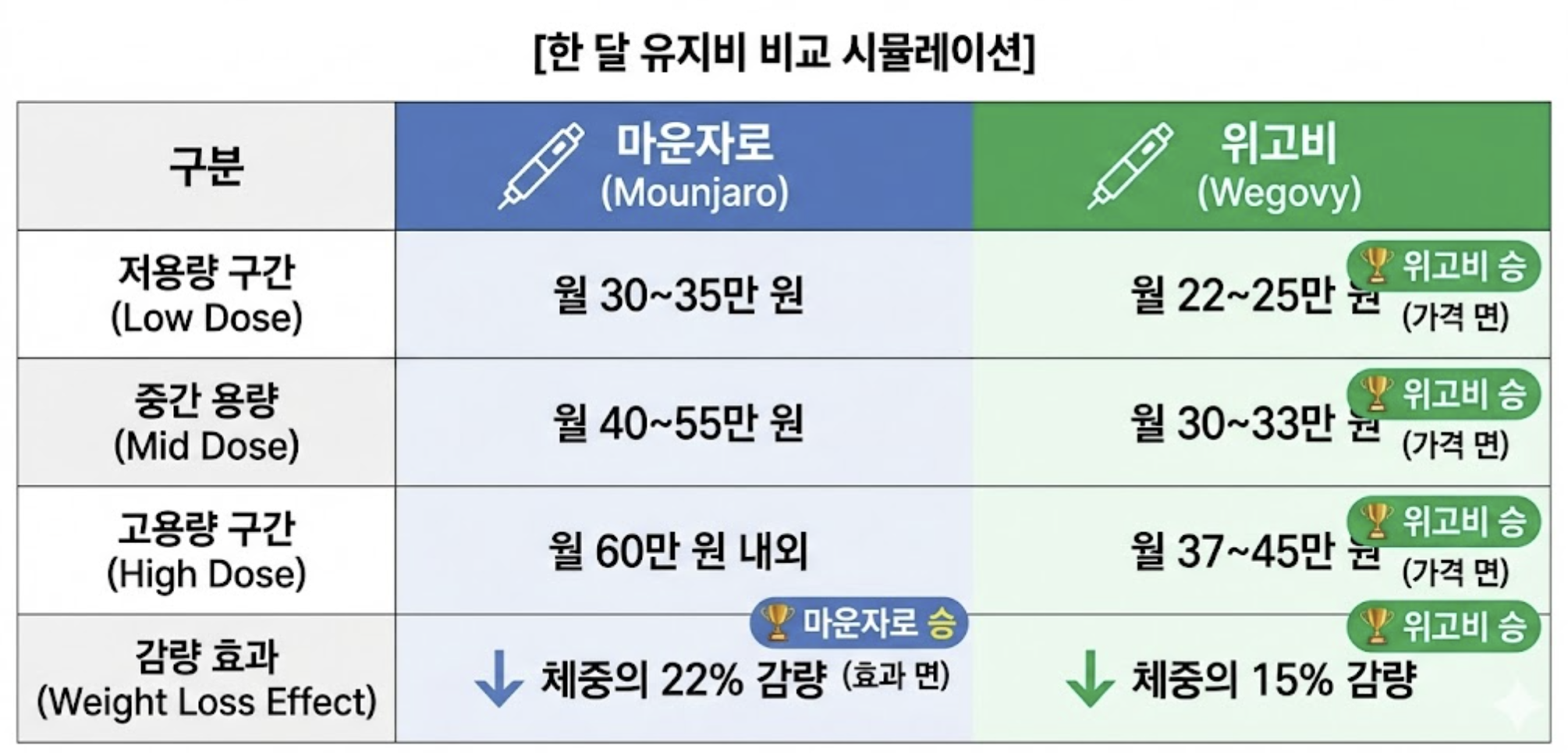 | 저용량 구간 | 월 30~35만 원 | 월 22~25만 원 | 🏆 위고비 승 |