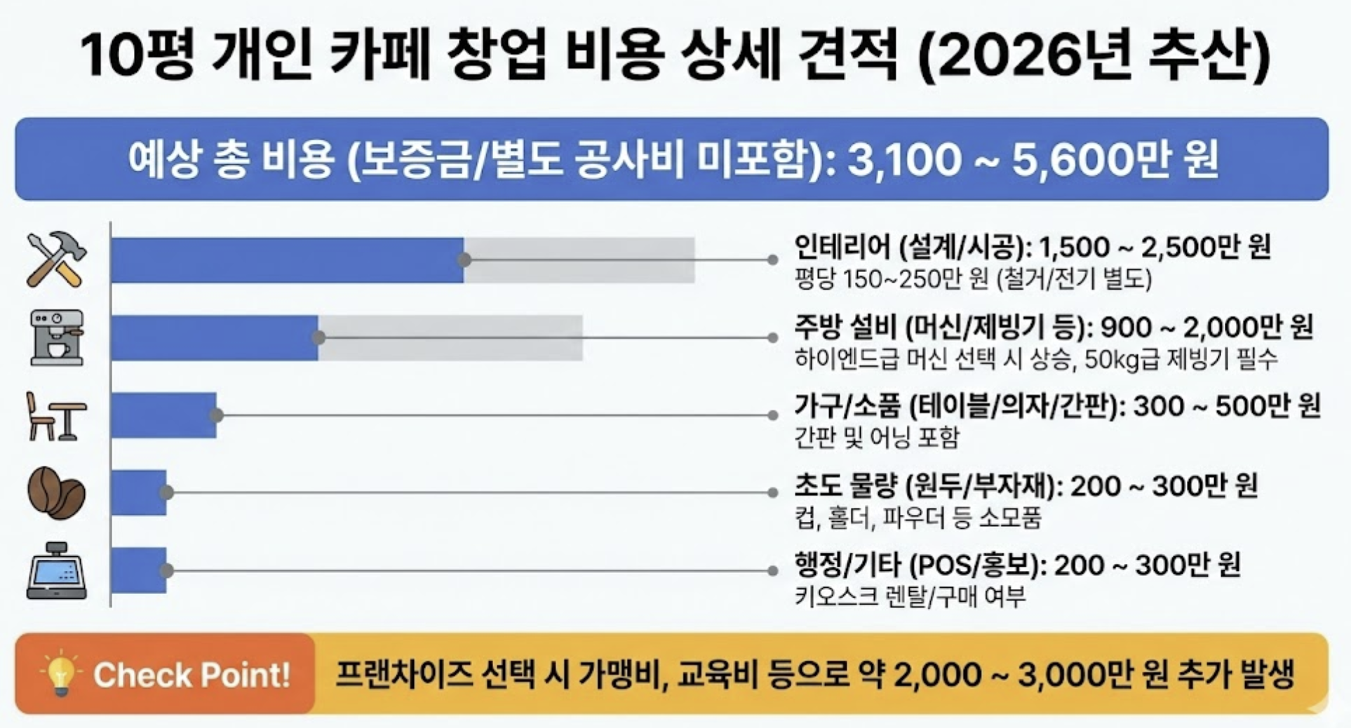 💡 Check Point: 위 표는 '개인 카페'를 기준으로 중급 장비를 세팅했을 때의 견적입니다. 프랜차이즈의 경우 가맹비, 교육비, 물품 보증금 등으로 약 2,000~3,000만 원이 추가됩니다.