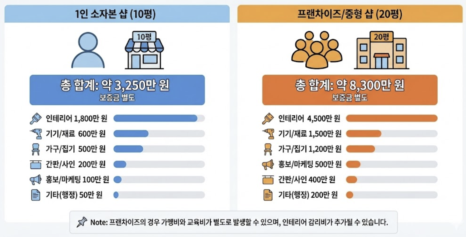 | 구분 | 1인 소자본 샵 (10평) | 프랜차이즈/중형 샵 (20평) | 비고 |