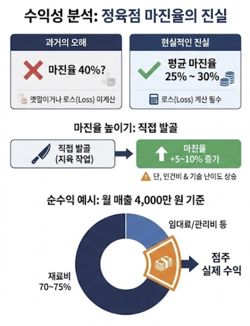 - 직접 발골(지육 작업)을 할 경우 마진율을 5~10% 정도 더 높일 수 있지만, 인건비와 기술적 난이도가 따릅니다.