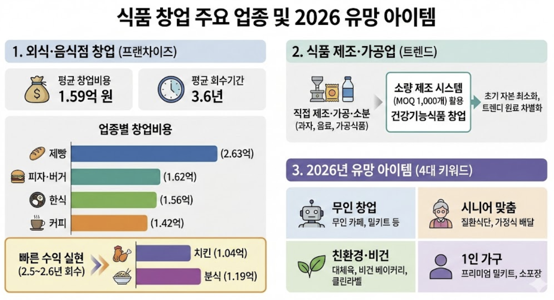 메타 디스크립션: 2026년 식품 창업 완벽 가이드. 영업허가·신고 절차, 정부 지원금(최대 5억), 업종별 창업비용, 성공 사례까지 한눈에 확인하세요. 소자본 창업 전략과 실패 원인 분석 포함.